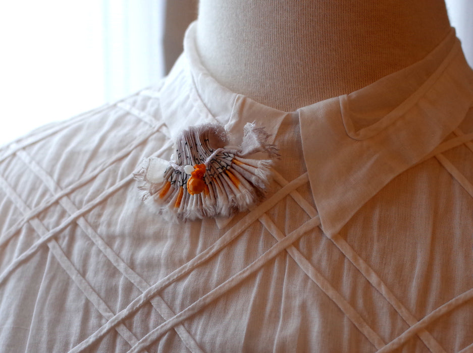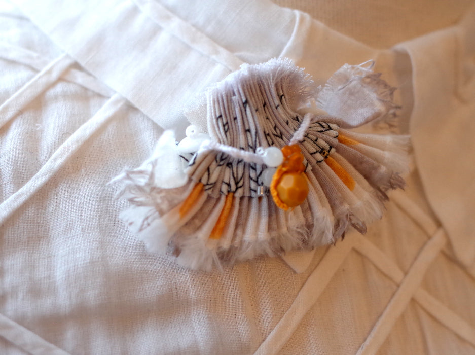 Broche réalisée en cousant de petits morceaux de tissu en lin