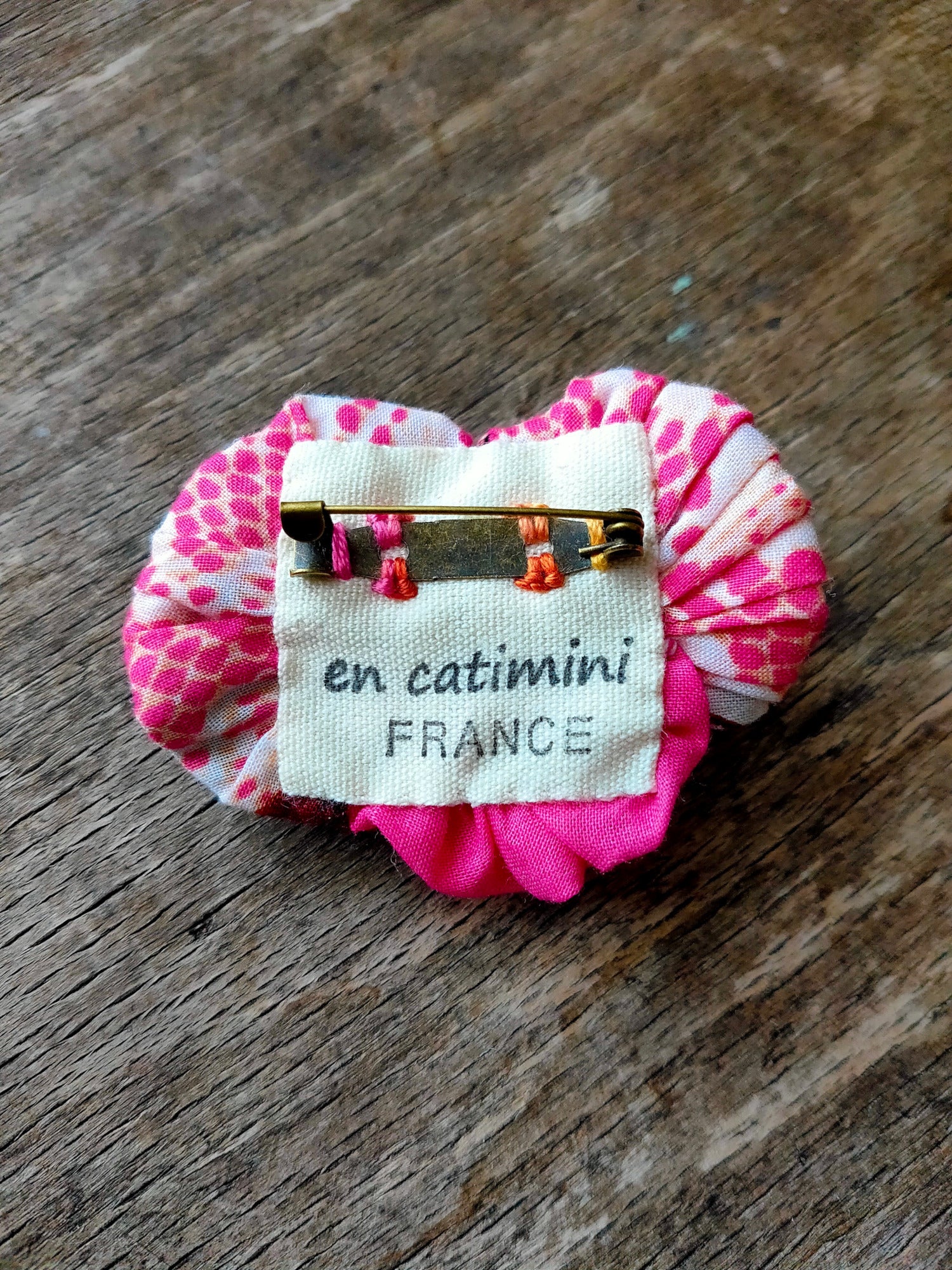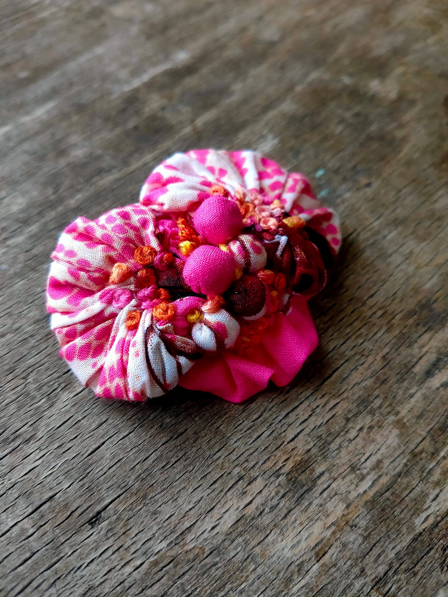 Broche réalisée en cousant de petits morceaux de tissu en coton