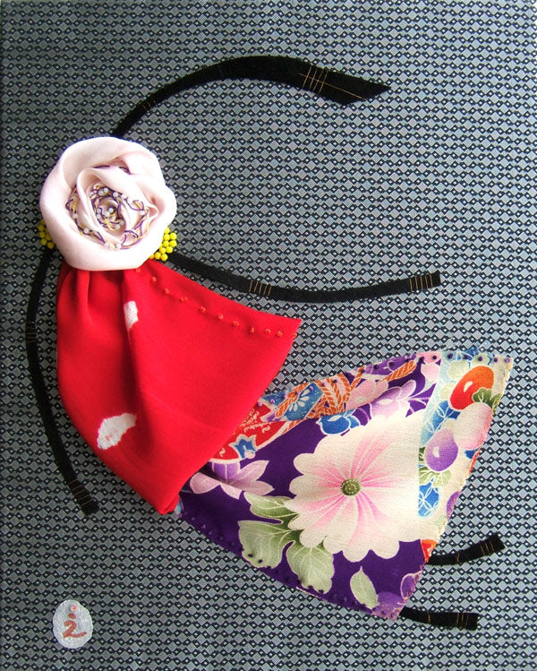Tableau de tissus cousus à l'aide de vieux tissus de kimono, de vieux tissus français, de dentelles anciennes, de perles, etc.