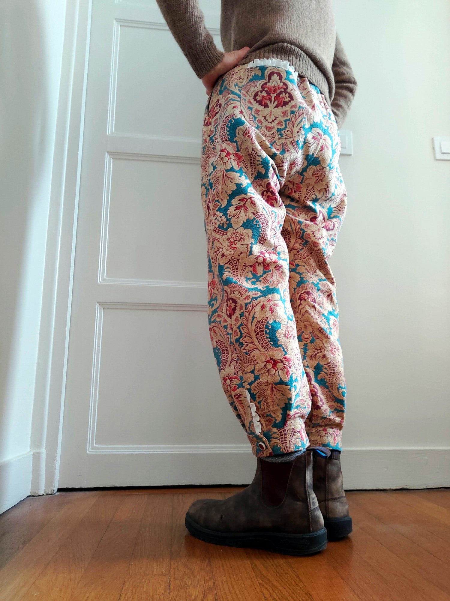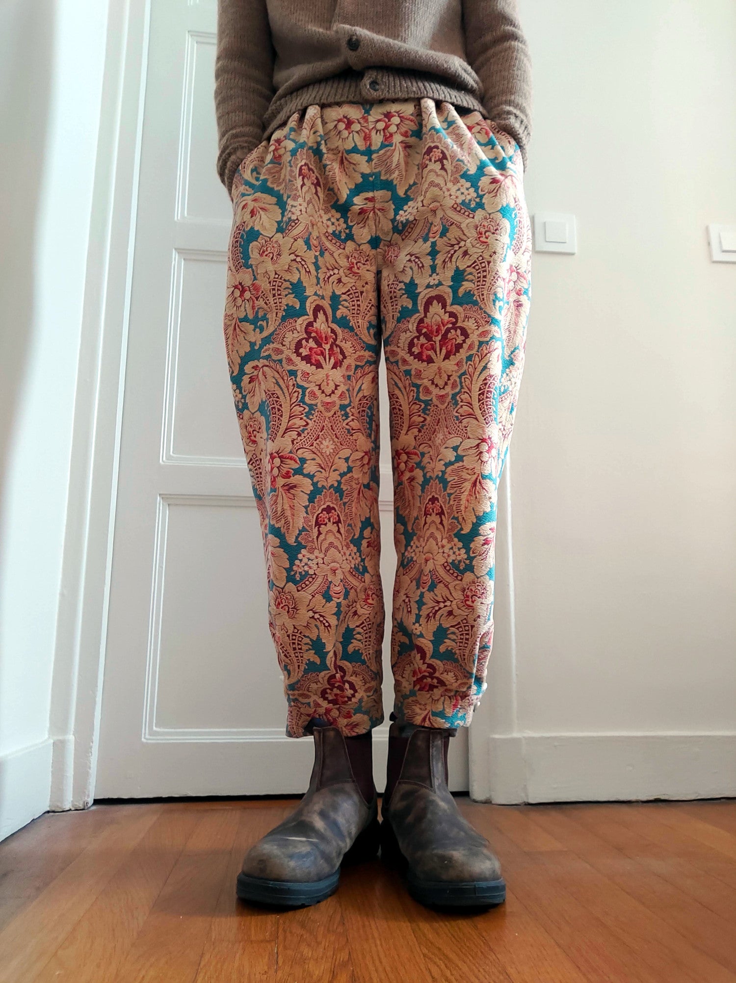 Un pantalon crée avec un vieux coussin français.